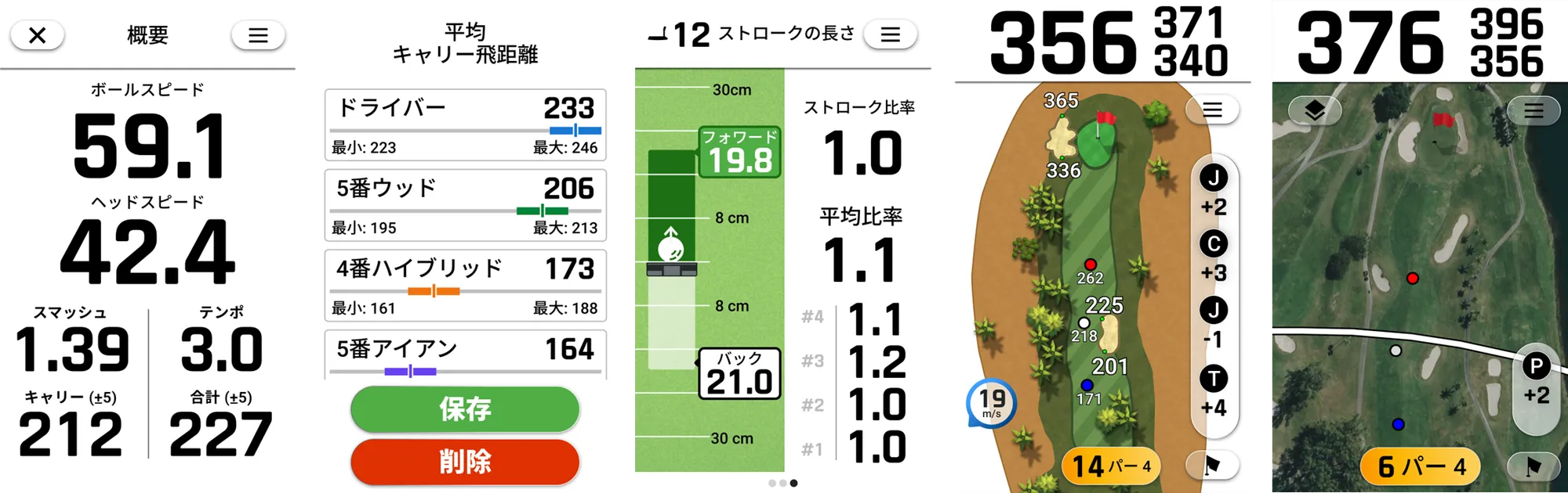 〈左から〉スイング計測、クラブマッピング、パッティングトレーニング、ゴルフナビ、航空写真表示の画面
