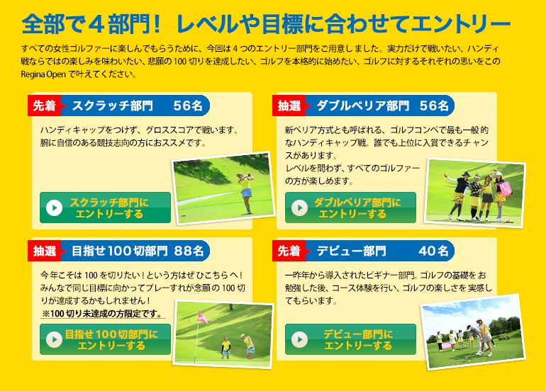 | 参加資格 | 【スクラッチ部門&ダブルペリア部門】 ゴルフ好きならどなたでもOK。スコアで勝負したいならスクラッチ部門、レベル問わず楽しみたいならダブルペリア部門をおすすめします。 【目指せ100切部門】 スコア100を切ったことのない方限定。平均スコアが100~110の方におすすめです。 ※すべての部門で個人での応募となります。(女性限定) ※尚、ペアでの参加希望の方は、個々でご応募いただき、お申し込み時に同組希望の旨をお申し出ください。(同組希望は原則1名までとさせて頂きます) 【デビュー部門】基本レッスンを受けた後、体験ラウンドを予定。 |
