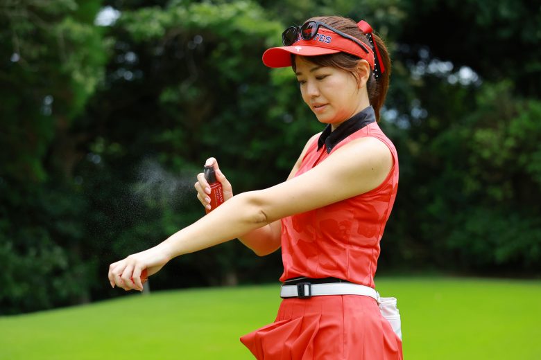 梅雨明け早々の開催となったこの日、晴天に恵まれたものの、強い日差しと厳しい暑さの中でティーオフ。そんなとき参加者への粋な計らいで喜ばれたのが花王アスリズム。各カートに用意された赤いボトルは、SPF50+ PA++++の防御効果で紫外線から守ってくれるミストUVです。長時間強い日差しを浴びてプレーする女性ゴルファーにとってはまさに心強いアイテム。ドレスコードの赤にマッチし、参加者たちに強い印象を残しました。