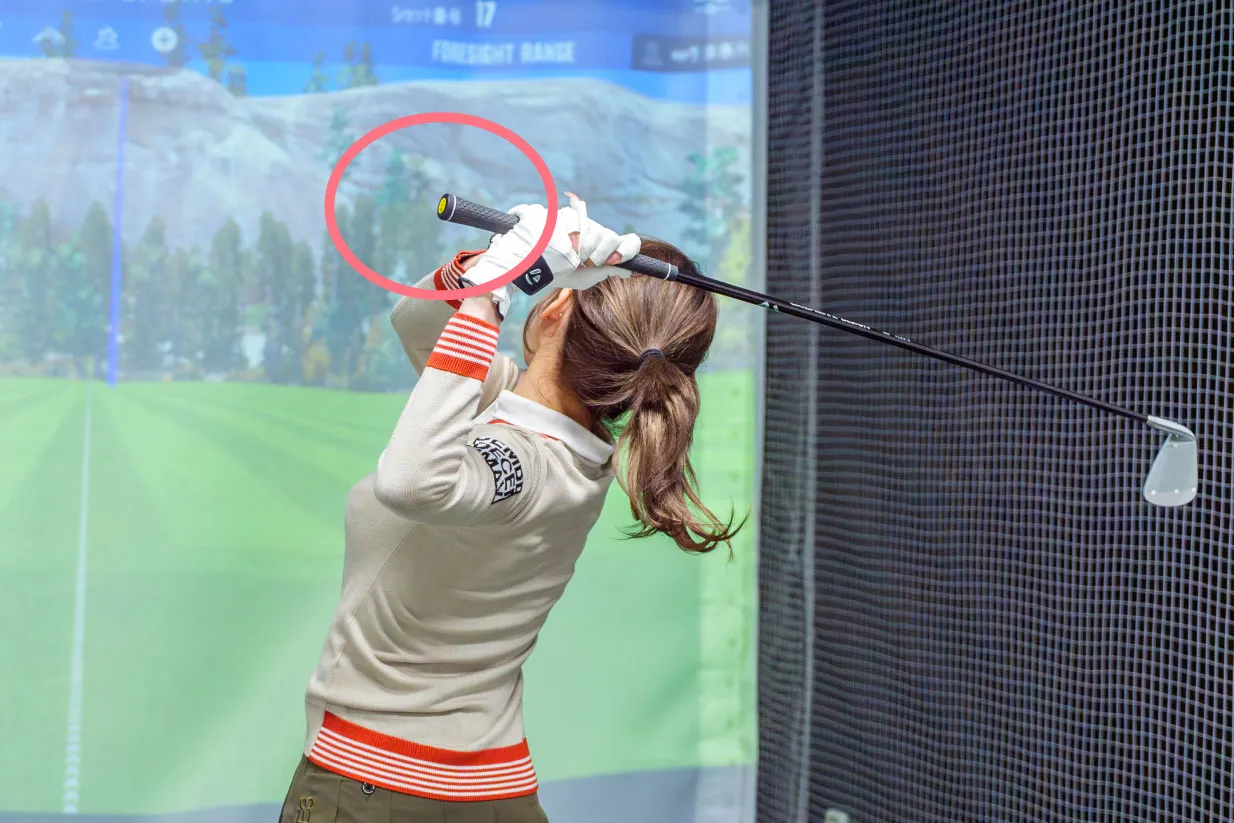 ここで岩本フィッター、千尋さんがクラブのグリップエンドをかなり余らせて持っていることに気がつきました。岩本さんによると、クラブを短く持ちすぎることもミスを誘発する原因にもつながるといいます。