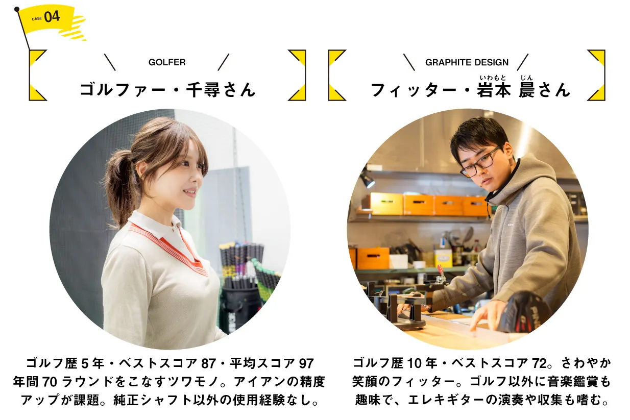 岩本フィッター「ボールに当たった感じもいいですね。千尋さんはテークバックがゆっくりで、トップからダウンスイングにかけてシャフトに負荷をかけるタイプです。こういう方は手元側が少し動いてくれる、粘り感のあるシャフトのほうが合うんです」