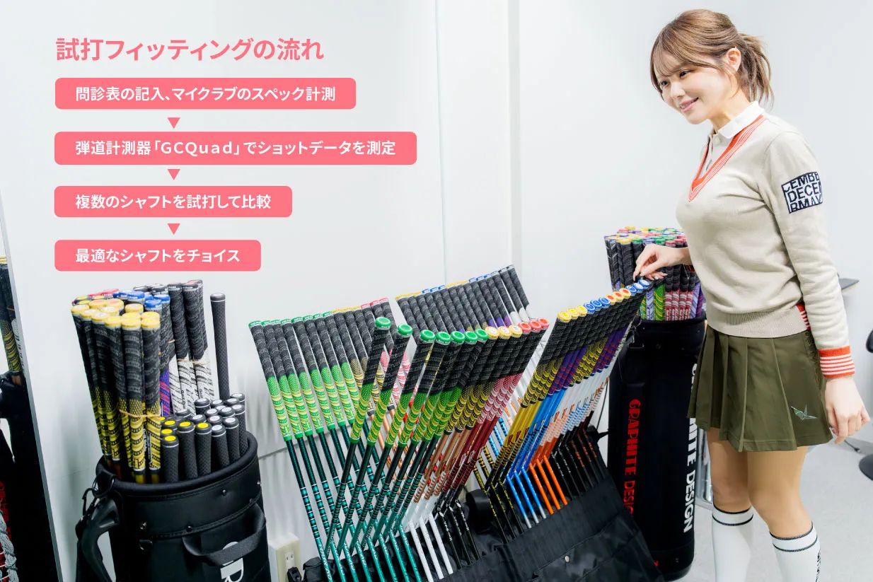 千尋さんは年間70ラウンドをこなすアクティブなゴルファーですが、純正シャフト以外を使った経験はほとんどないと言います。「アイアンの精度を上げて方向性を安定させたい」とのことで、今回はアイアンのシャフトフィッティングを受けることに。千尋さんがトライした「試打フィッティング」の流れは以下。