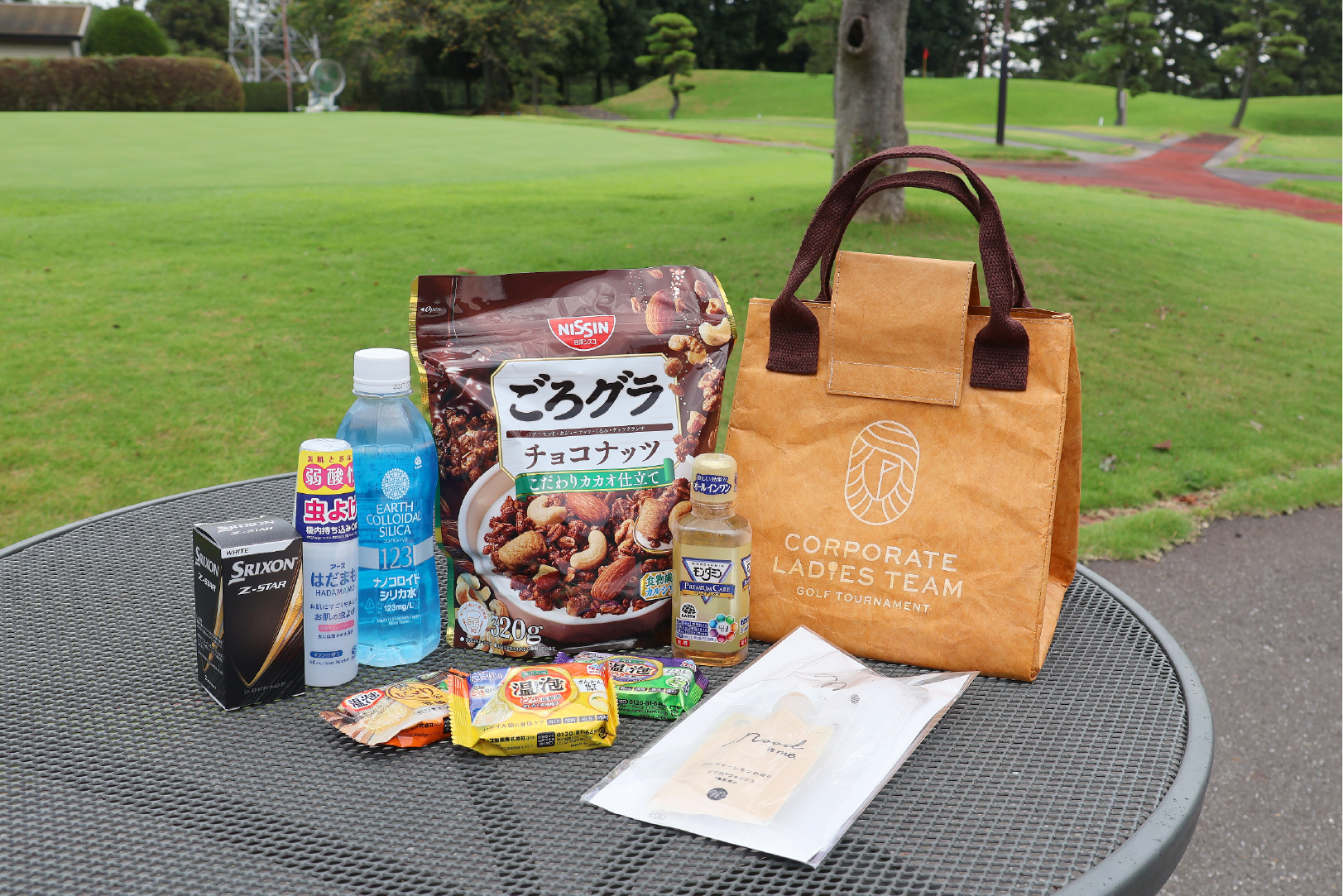 スタート前には、大会オリジナルデザインのエコ素材保冷バッグが参加者全員にプレゼントされました。マチが広く、夏ラウンドで大活躍してくれる実用性の高いバッグの他にも、アース製薬のシリカ水やダンロップのゴルフボール、さらには美容・ヘルスケアアイテムまでが盛りだくさん! 「参加賞も楽しみのひとつです」という喜びの声も。