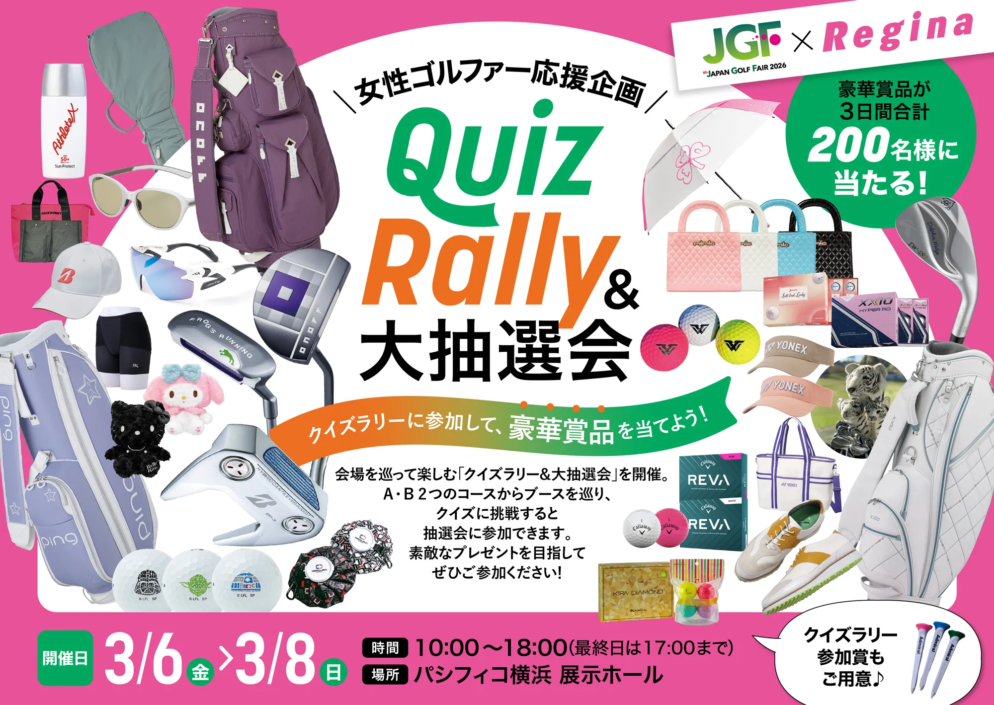 期間中、来場いただいた女性ゴルファーの皆さまには、もれなくReginaオリジナルリーフレットをプレゼント。冊子内のマップに掲載されているブースをまわり、スマホからクイズラリーに回答すると、豪華景品が当たる抽選会に参加できます。