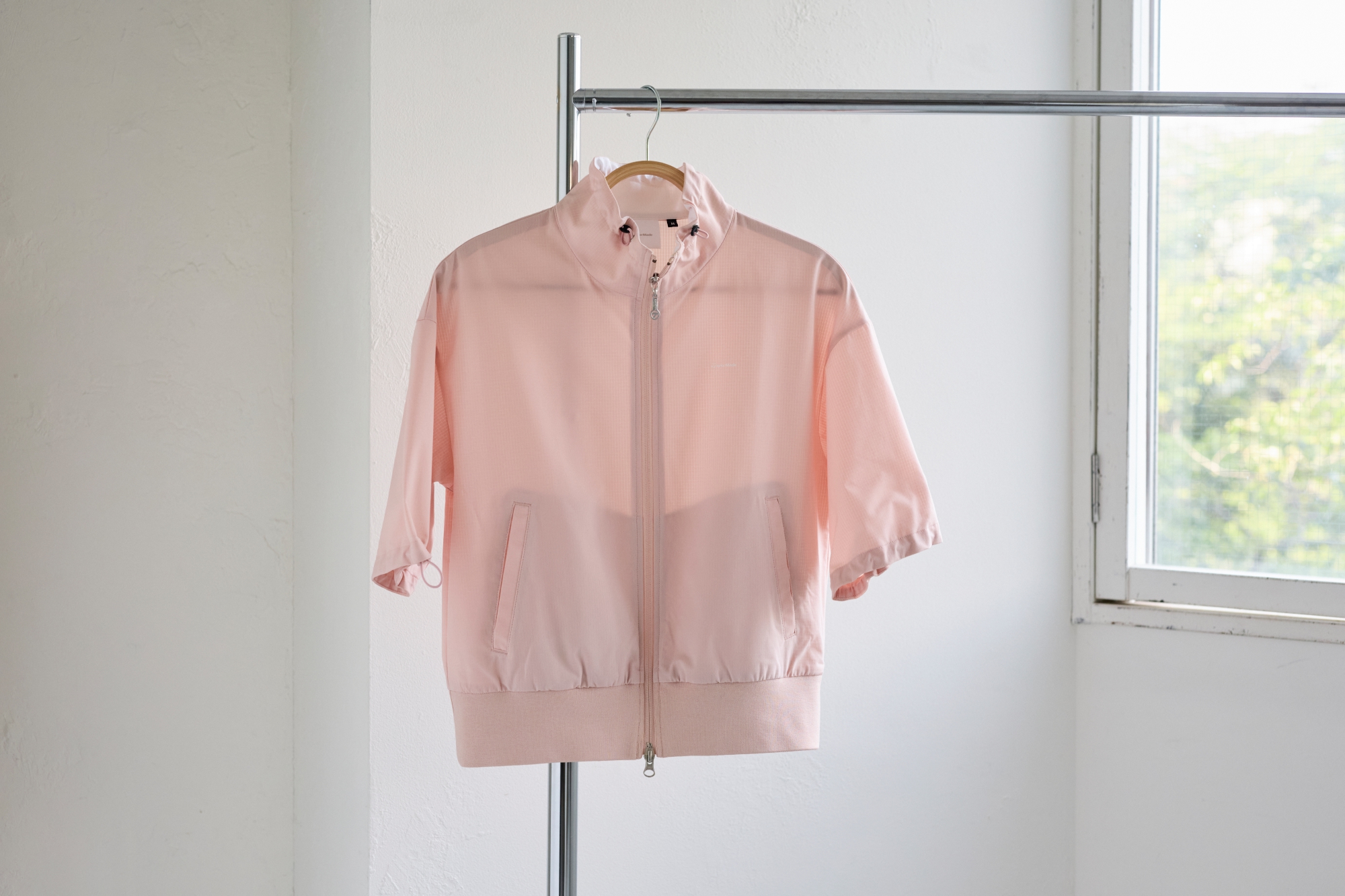 通気効果の高い素材を採用した快適な着心地のジャケットは、1枚持っているとシーズンレスで活躍してくれるでしょう。袖や首元のドローコードでキュッと絞ることで、シルエットの変化を楽しめます。撥水性、ストレッチ性があり、急な雨などのゴルフ中の天候変化にも対応。柔らかなトーンのくすみピンクがコーディネートにも馴染みやすく、お洒落を盛り上げてくれるはず!