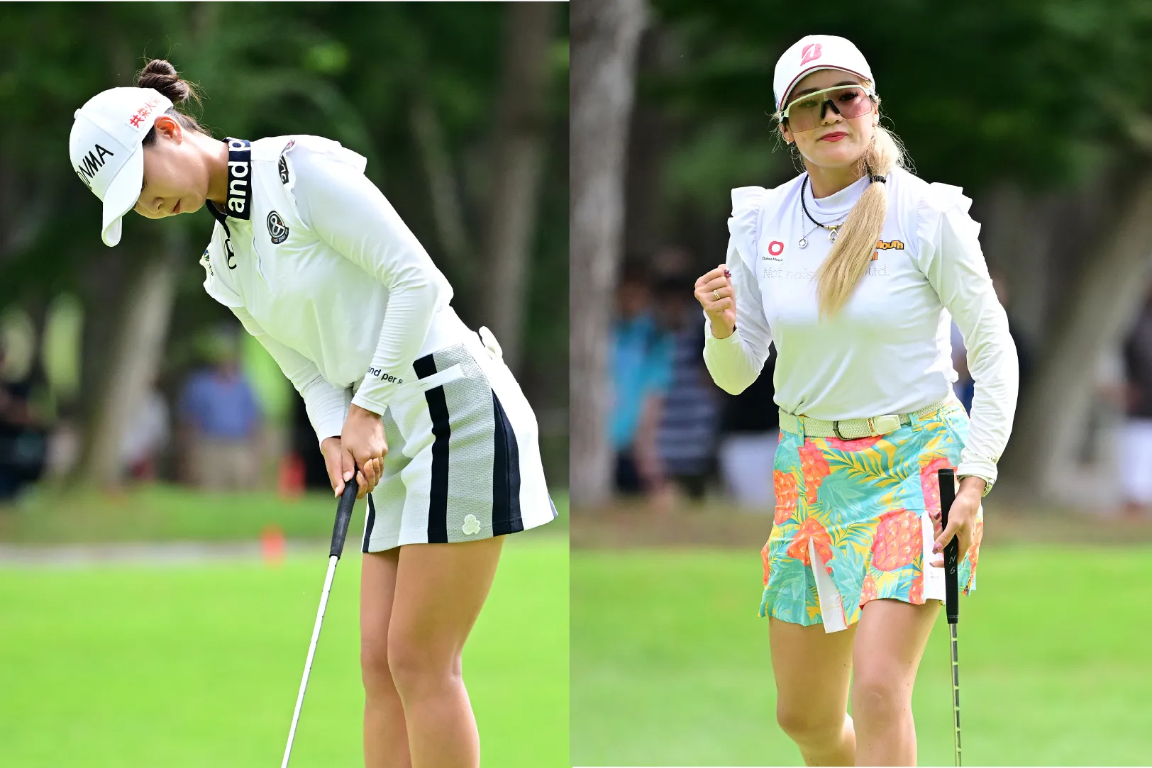 一方の桑木プロは、鮮やかなトロピカル柄スカートをセレクト。フェミニンなフリル袖トップスに大胆な柄を合わせることで、健康的でヘルシーなテイストミックスを完成させています。
