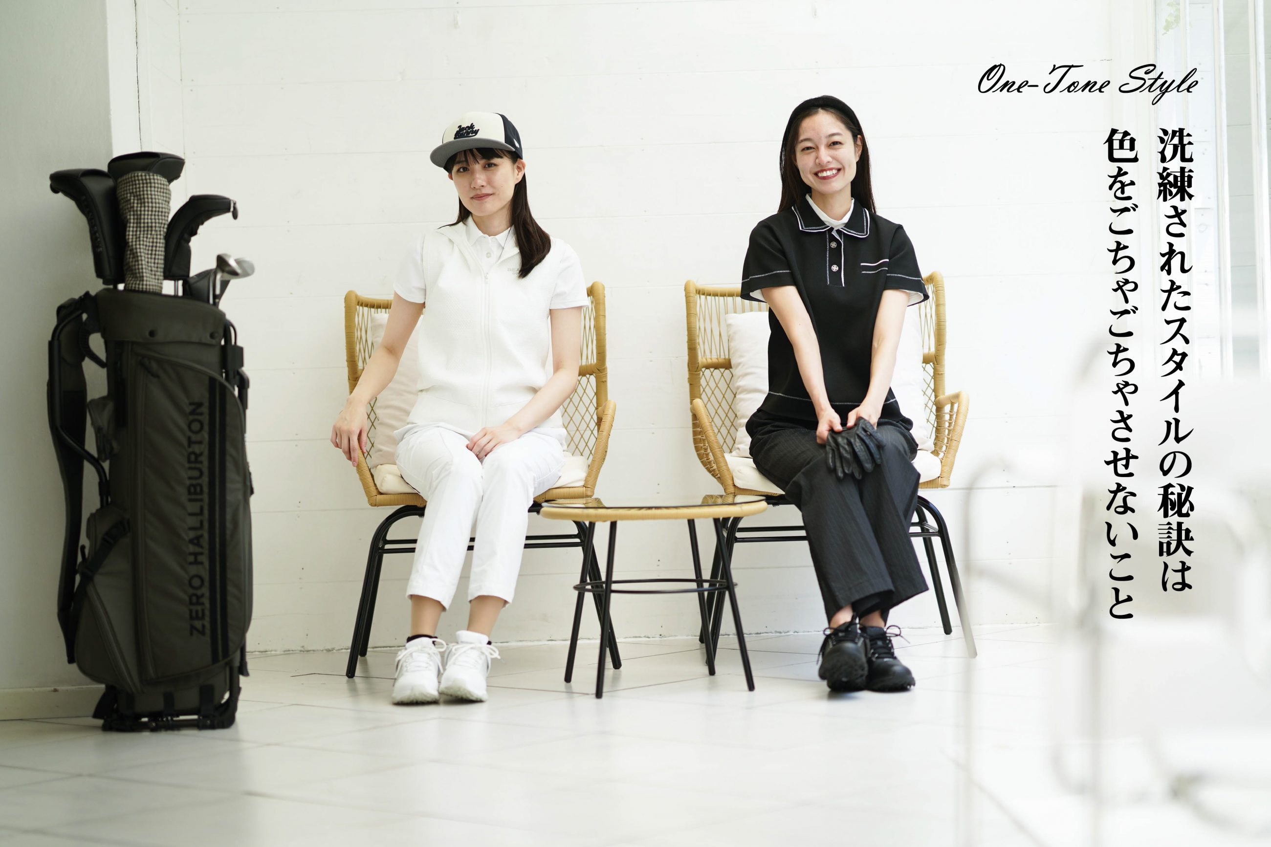 遠くから全身で見られることが多いゴルフ場での装い。定番色での着こなしは、地味なオジサン風になりすぎる危険性があるけれど、色をたくさん使わずにまとめると、地味色でもスタイリッシュに仕上がります。なかでもワントーンなら、全身の統一感が感じられ、名門倶楽部にふさわしい上品な佇まいがすぐ完成。その場合、トリミングデザインや重ね着などでメリハリをつくると、より洗練された雰囲気に。もし色を混ぜる場合でも、2色までに絞ってコーディネートするのがおすすめです。