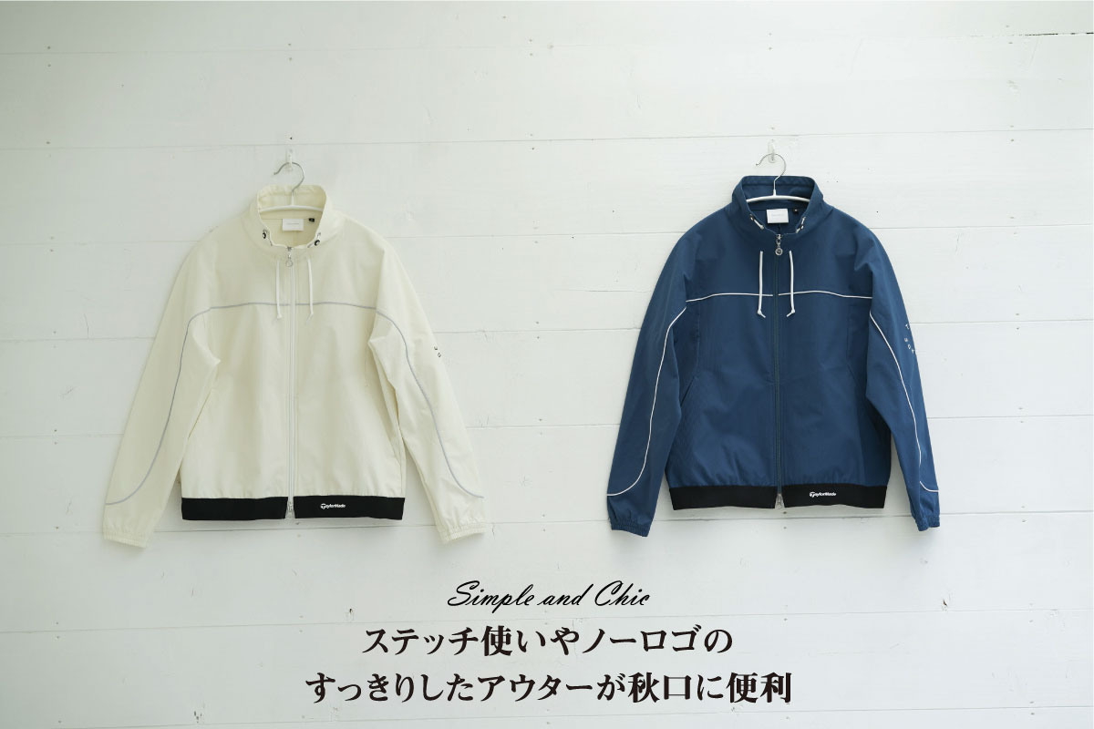気温の変化が激しい秋の気配にふさわしいのは、着脱が簡単なジップアップアウター。ロゴ使いやデザインが奇抜にならず、でもさりげないステッチ使いがおしゃれなスポーツアウターなら、はおるだけで大人のシンプル&シックが実現。名門ゴルフ場にもふさわしいスポーツカジュアルに。アウターに使用される色だけをインやボトムにチョイスして、すっきりシックな着こなしを目指して。さらっとした軽量のメッシュ素材で、撥水性もUVプロテクト機能もあるので、ブリッジシーズンに大活躍!
