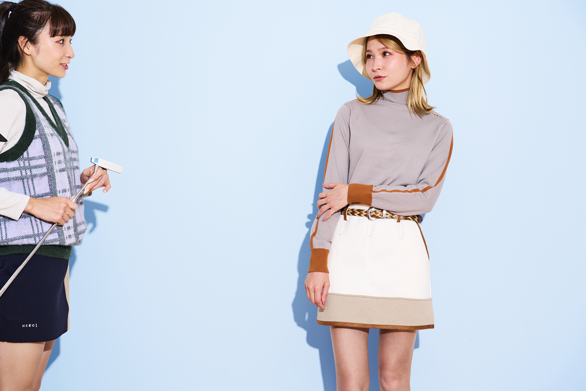 「わかりやすい“可愛いカラー”はないのですが、ニット、スカートともに、ほかのゴルフウェアではあまり見かけない色づかいがエルグワンらしさですね。キャピキャピしない上品でエレガントなゴルフスタイル、しかも秋冬らしいルックスはコースに絶対映えるはずです。