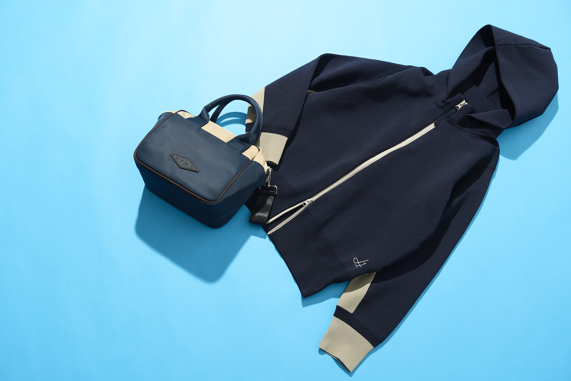 フードがついたブルゾンは軽やかな着心地ですが、素材にスウェットやジャージではなくニットを用いているため、女性らしいシルエットが引き立つシックな印象が生まれます。フードが着脱できることで着まわしの幅が広がるところもお役立ち。袖口のリブと袖の下部で大胆に切り替えしを施した配色で、スポーティさを「エルグワン」らしく表現しています。パンツにもスカートにも合わせやすく、もちろんタウンユースとしても自在に活躍してくれそうです。