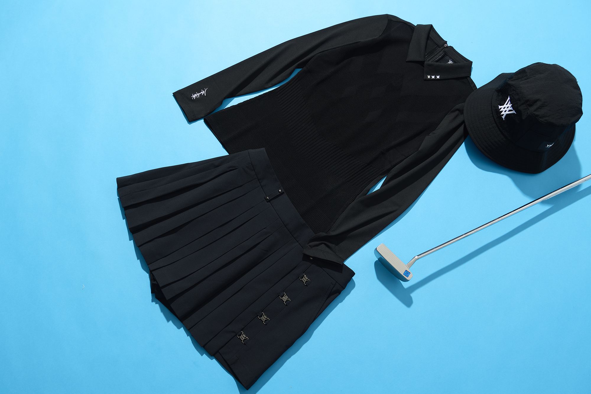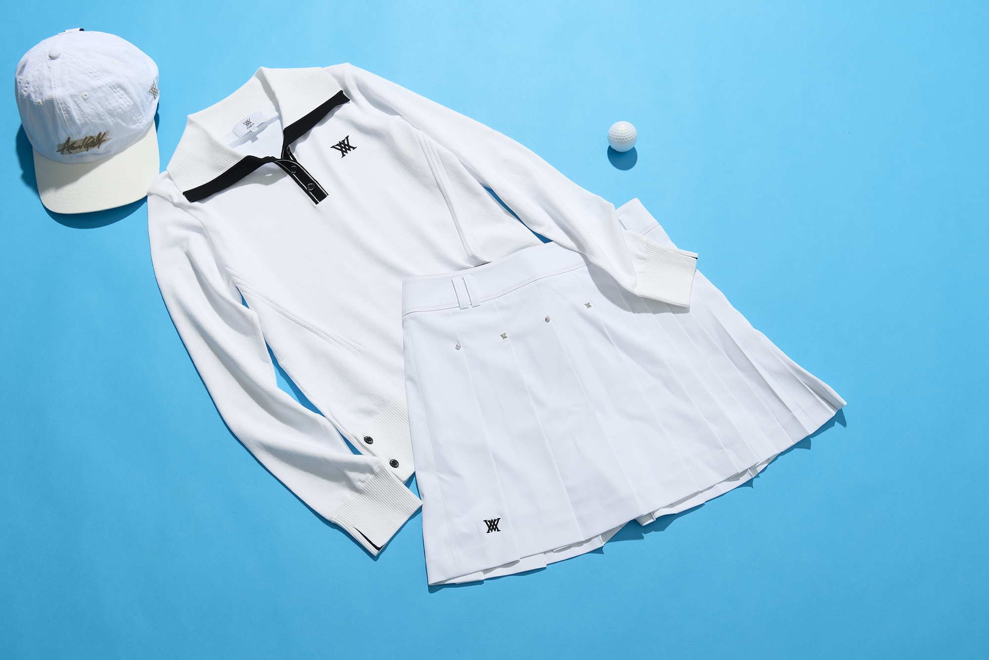 「アニューゴルフ」のラインナップには鮮やかなネオンカラーなどを生かしたアイテムも多いのですが、お得意とするブラックやホワイトでまとめたモノトーンのウェアを選べばスタイリングはいつもとはガラリと一新。ゴルファーのおしゃれなイメチェンスタイルができあがります。