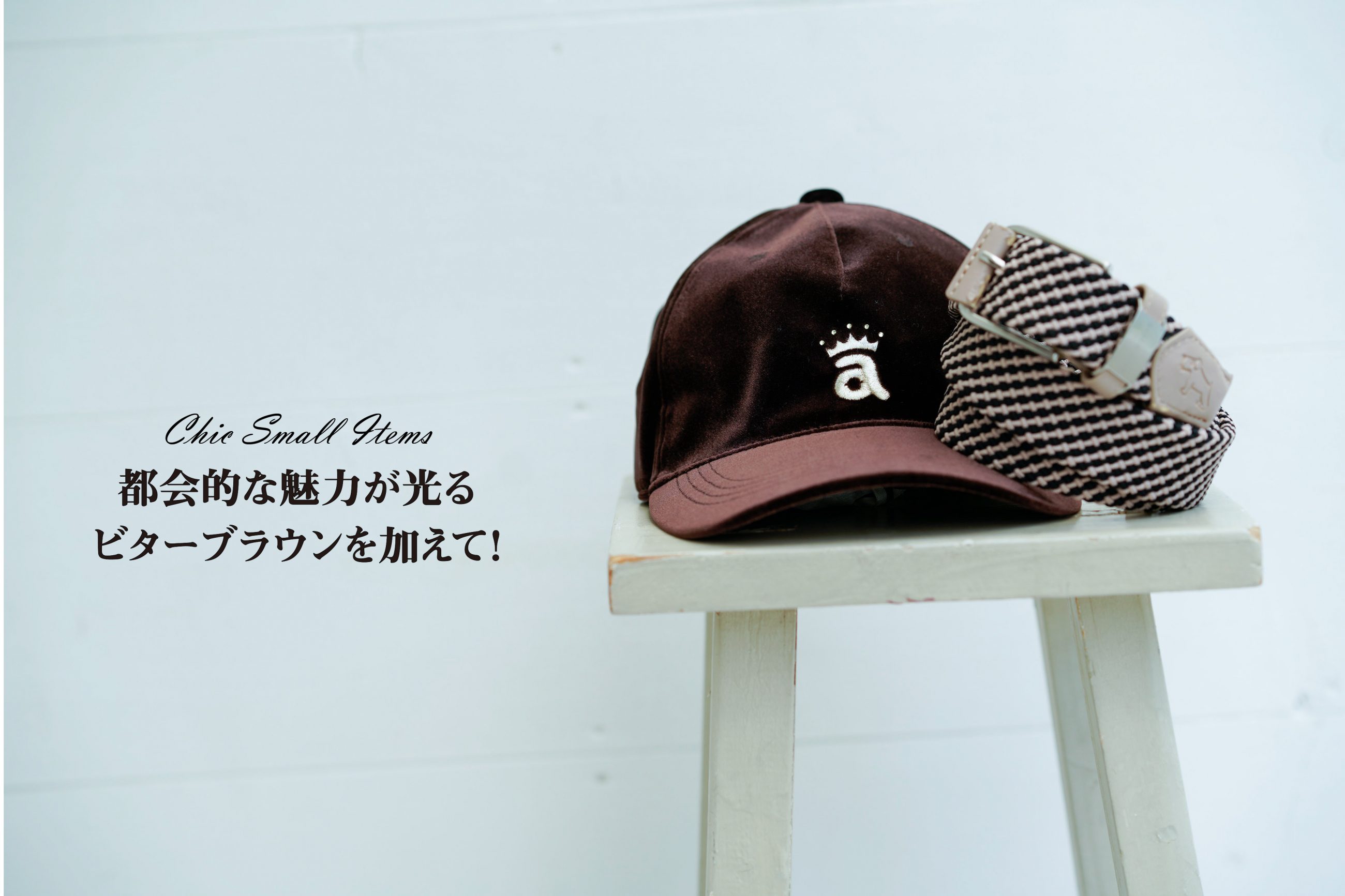 ブラウンの持ち味は優しい癒し系ですが、ビターなブラウンなら辛口で都会的な着こなしを叶えてくれます。気の利いたビターブラウンのキャップやベルトがあれば、ほんわかしたベージュの淡いコーデを大人っぽく引き締めます。