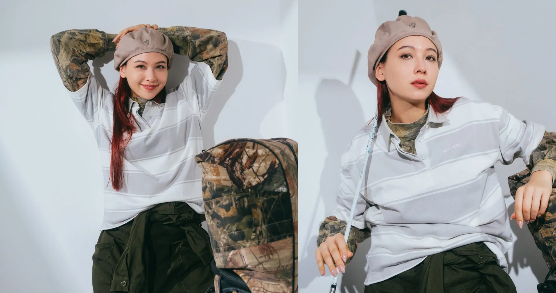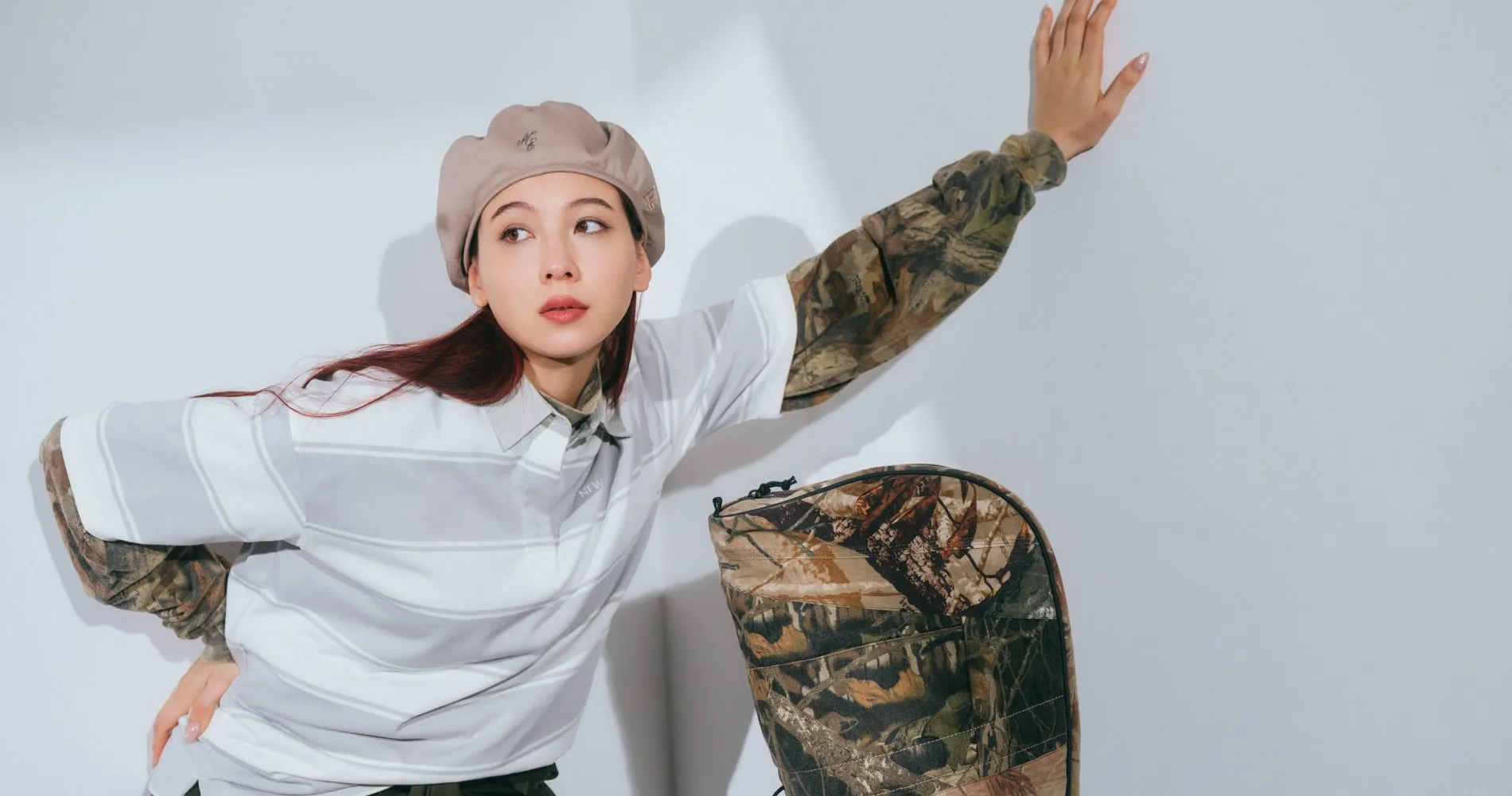 コーデの主役は一枚でサマになる“ザ・ミリタリー”なカーキのジャンプスーツ。ややルーズめなシルエットですが、袖を腰巻きにしてウエストマークすることで、メリハリがついた印象に。トップスはボーダーポロとリアルツリーカモ柄カットソーの重ね着で、ボトムスに負けないインパクトがありつつも、統一感のあるまとまった着こなしに仕上がります。ストレートヘアにタイトなアーミーベレーを合わせれば、ミリタリーなオーラをまとった色気あるスタイリングが完成。
