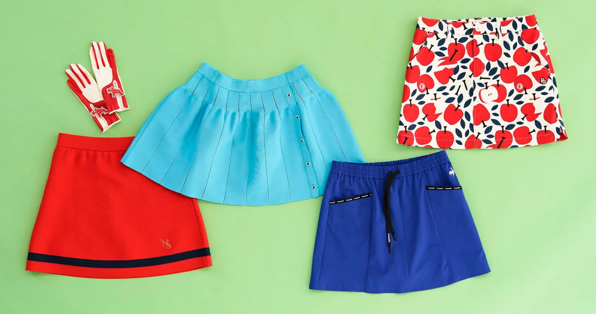 左から/赤ニットのスカート¥29,700(NS23parNissaGolf/ジュニアー東京支店NissaGolf事業部)水色のニットスカート¥31,900(アルチビオ/ビキジャパン)ロイヤルブルーのスカート¥13,200(ルコックスポルティフゴルフ)プリントスカート¥29,700(パーリーゲイツ) グローブ<両手>¥9,020(パーリーゲイツ)