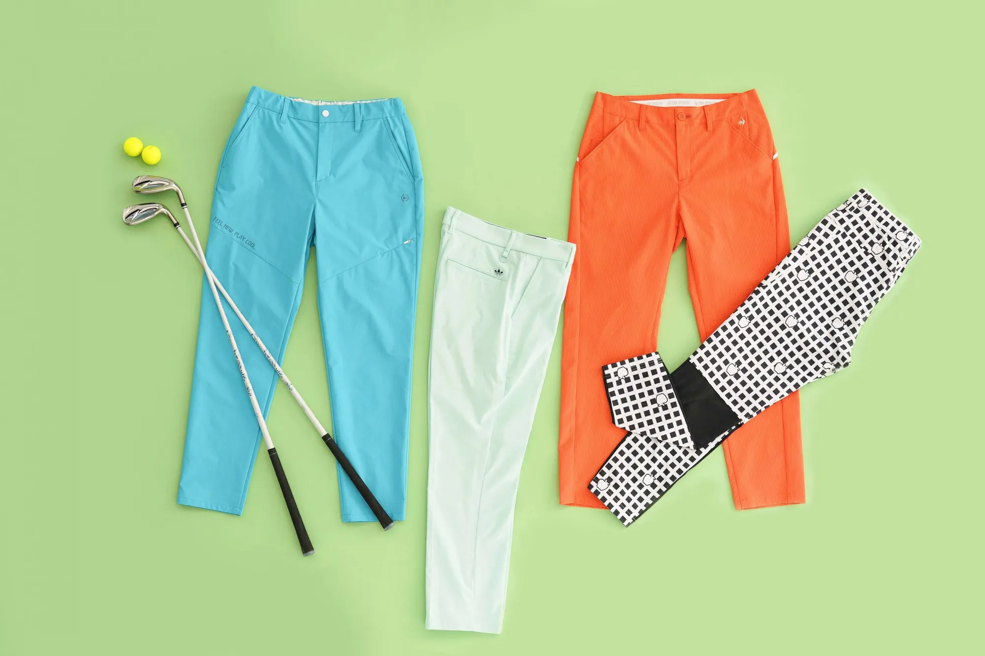 〈左から〉ブルーのパンツ¥20,900(ピン/ピンゴルフジャパン) ミントグリーンのパンツ¥18,700(アディダスゴルフ/アディダス ゴルフお客様窓口)オレンジのパンツ¥12,100(ルコックスポルティフゴルフ)プリントパンツ¥30,800(パーリーゲイツ)