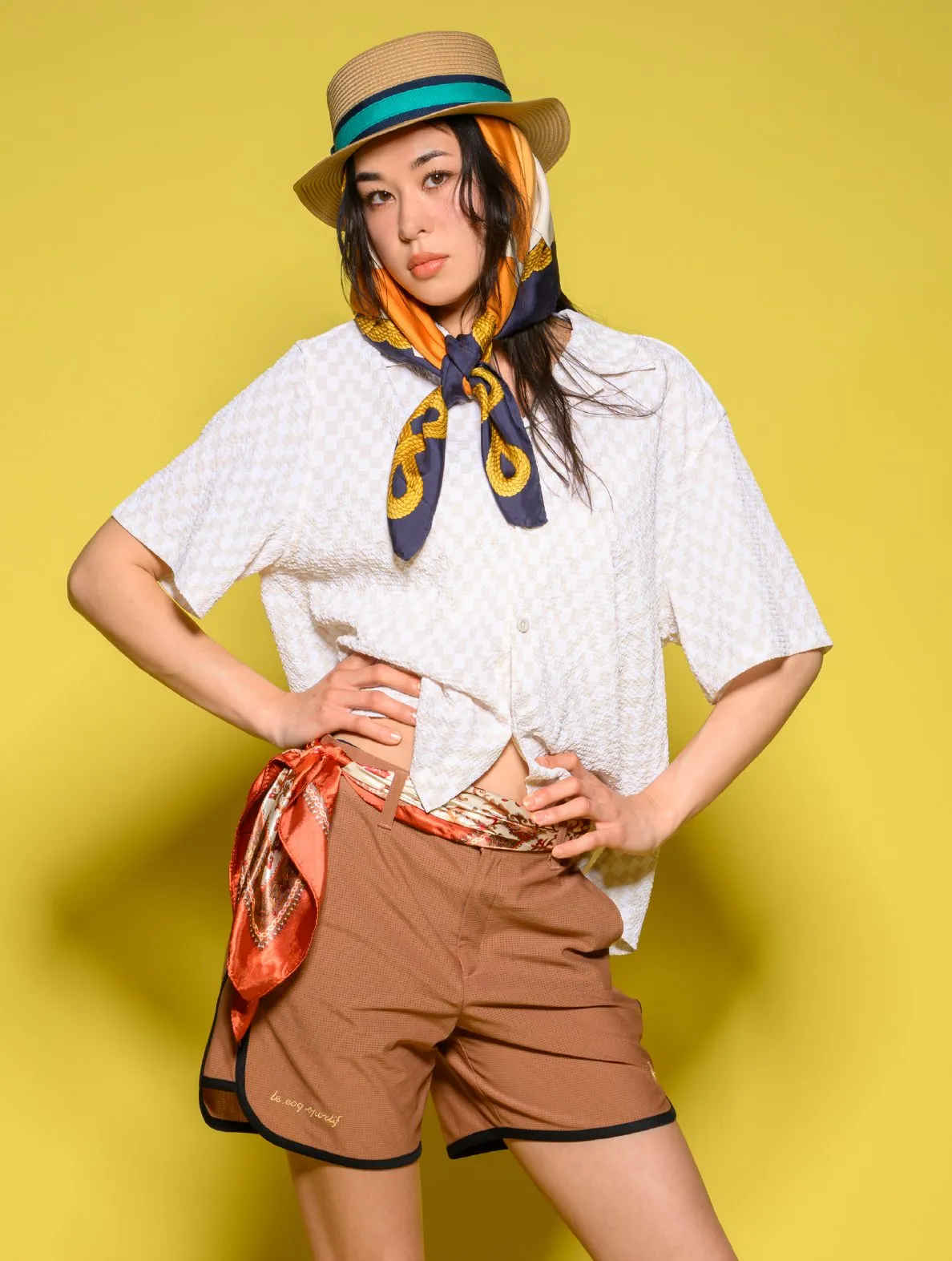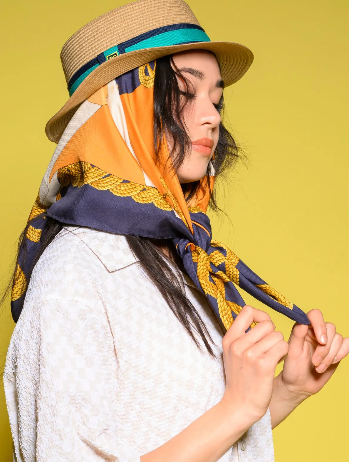 ハットの下にスカーフを一枚かませるだけで、オープンカラーシャツ×カンカン帽のカジュアルスタイルが一気にレディな印象に。つばの狭い帽子を被りたい日は、スカーフを使うことで耳やうなじの日焼け対策にもなり一石二鳥です。さりげなくいつもと印象を変えたい人は、ベルトがわりにボトムスのループに通すのも良いアクセントになります。