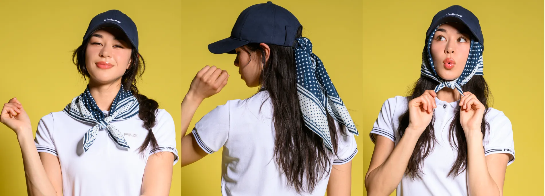 巻く位置や巻き方によって、同じウェアとスカーフの組み合わせでも全然違った印象になるのがおもしろいところ。覚えておいて損はない、ゴルフで使える3パターンのアレンジを紹介します。