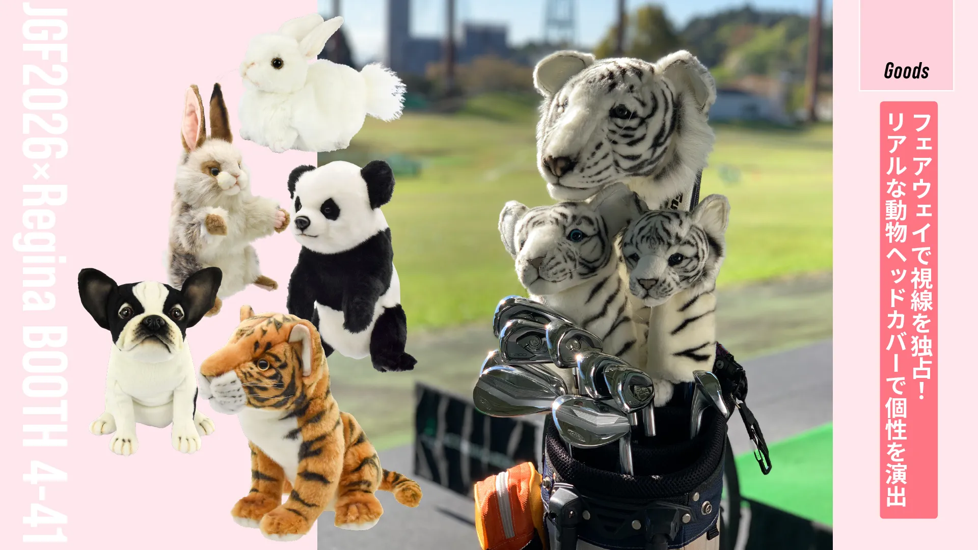 世界24カ国で愛される「HANSA(ハンサ)」のリアルな動物ぬいぐるみを、そのままヘッドカバーにした人気シリーズ。精巧な表情や質感にこだわったデザインは、フェアウェイでもひときわ目を引きます。ドライバーからUTまでそろえればバッグに統一感が生まれ、個性あるコーディネートが楽しめます。JGF会場でずらりと並ぶ動物たちは圧巻。ぜひブースへ。