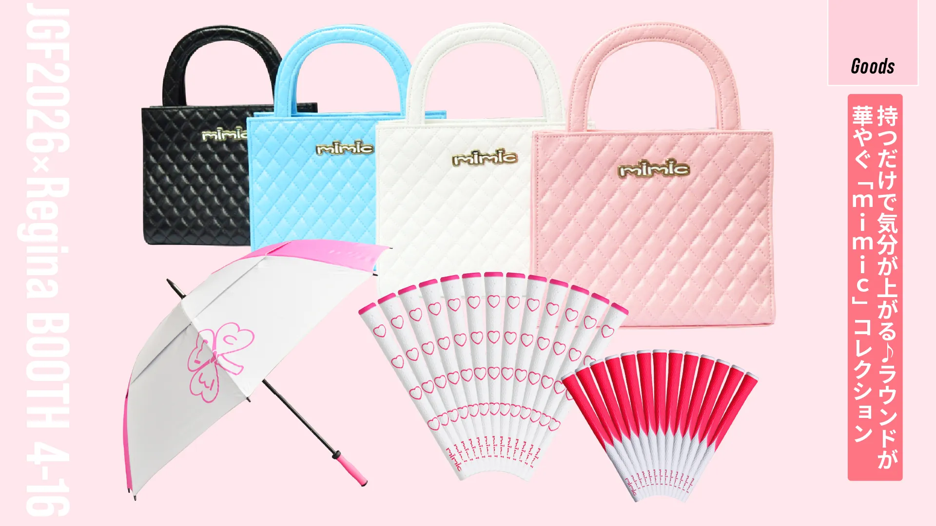 「イオミック」発のレディスブランド「mimic(ミミック)」は、“持っているだけで気分が上がる”をテーマに、機能性とデザイン性を両立したアイテムを展開。上品な質感で大人可愛いハンドバッグや、グリップ素材の持ち手を採用した晴雨兼用アンブレラ、好みで選べるカラフルなグリップなど、実用的で遊び心あるラインアップが魅力です。ゴルフ女子の声を反映した商品開発で新作も続々登場。ぜひ注目して。