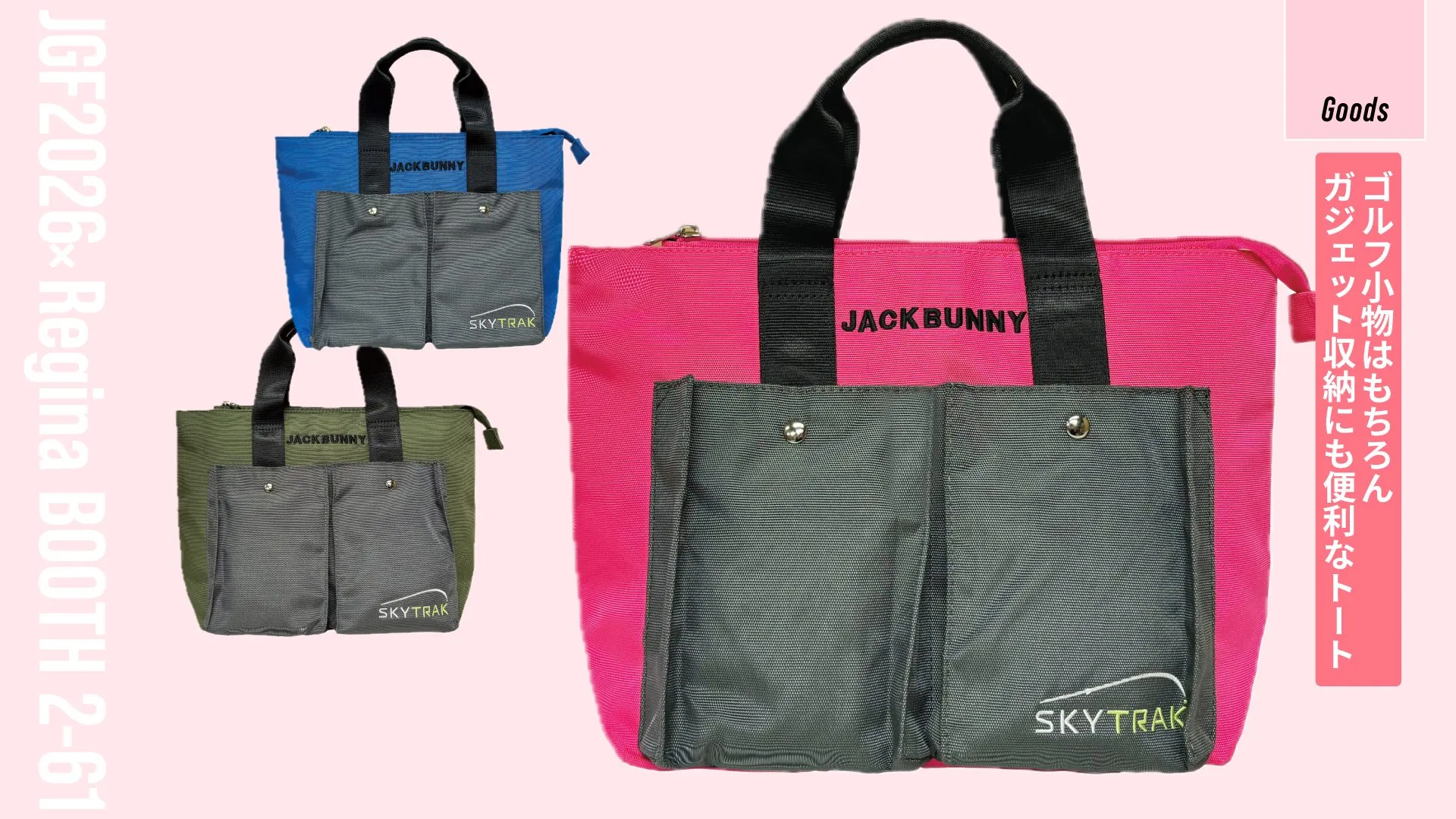 人気ブランド「ジャックバニー!!」とコラボしたオリジナルキャリーバッグを数量限定生産。バッグの中で散らばりがちなモバイルバッテリーやケーブル、リップクリームなどの小物を整理して収納できるポケットが多数備えられています。ラウンド時のカートバッグとしてはもちろん、ショッピングやお散歩バッグとしても活躍してくれます。