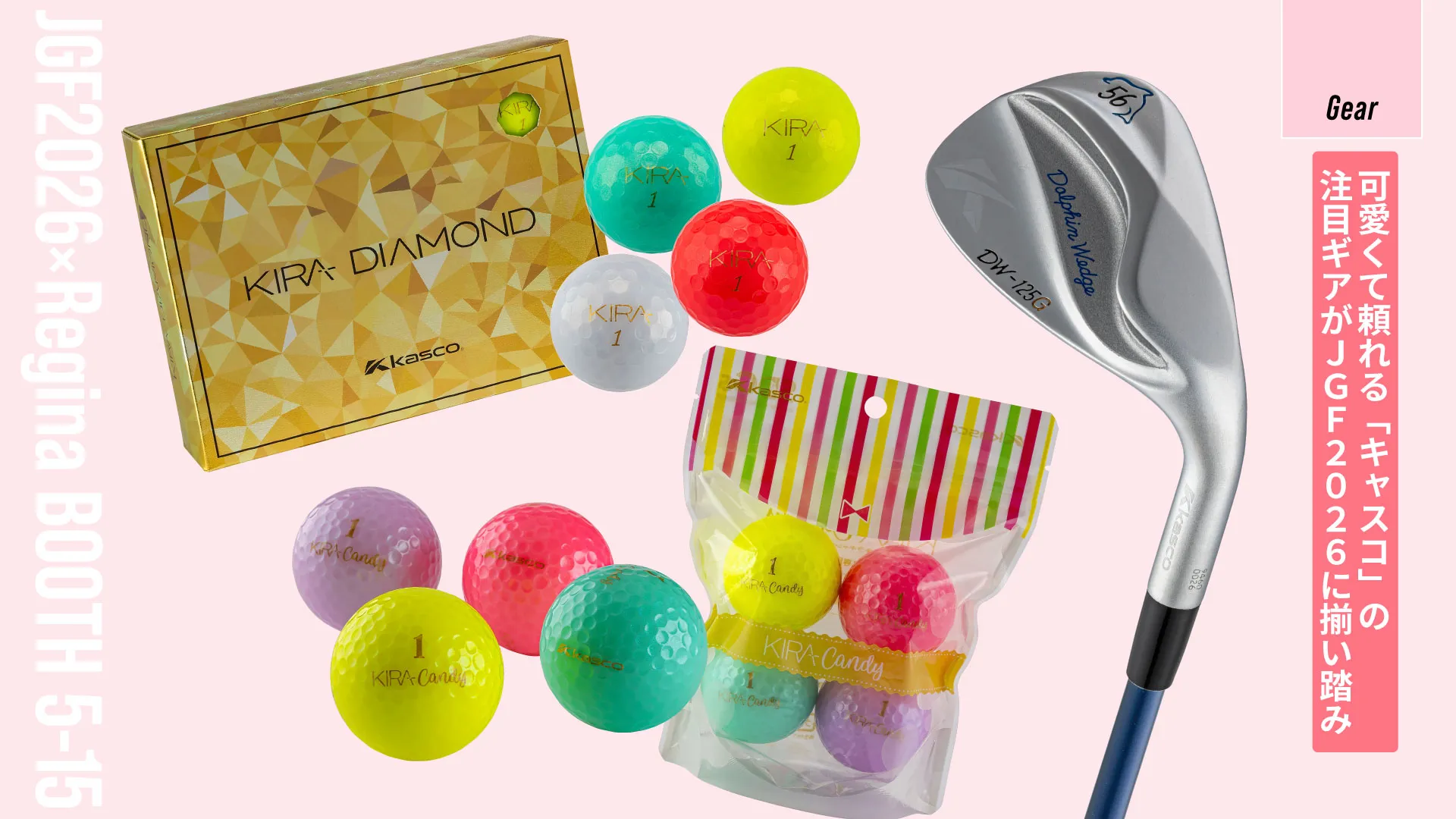 女性ゴルファーにうれしいキャスコの注目ギアがJGFに集結。「DOLPHIN WEDGE DW-125G for LADIES」は、あらゆるライで抜けがよく、バンカーも安心して寄せられるやさしい設計。宝石のようにきらめくボール「KIRA DIAMOND」は、飛んで止まって視認性も高い実力派。キャンディカラーが可愛い「KIRA Candy」は軽量で上がりやすく、女性専用設計でしっかり飛ばせます。エコなパッケージも注目度◎。見た目の楽しさと頼れる性能で、ラウンドがもっと心弾む時間になりそう。