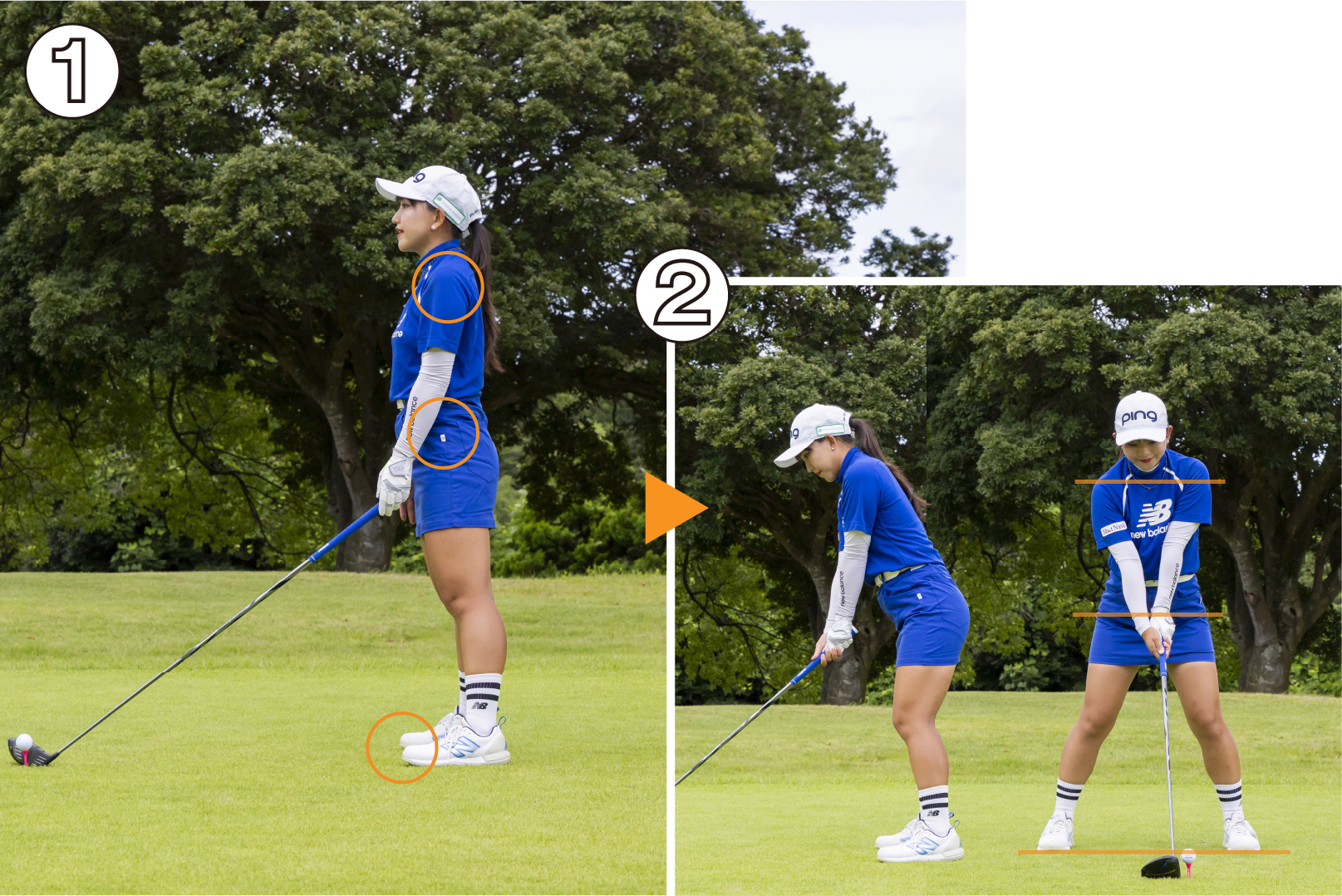 鈴木プロ「私がアドレスで大切にしているのは、ボールと目標を結んだラインに対して体のラインをスクエアに合わせることです。とくに肩、骨盤、スタンスの3大ラインは必須です。