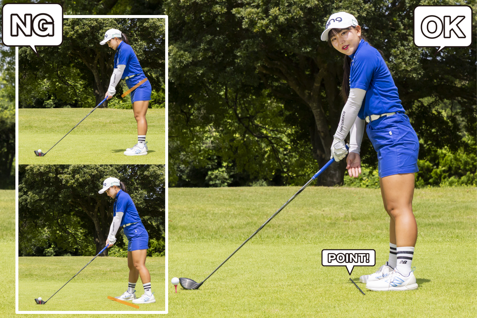 肩のラインがスクエアでも骨盤やスタンスのラインが右左を向くのはNG。練習では足元にスティックなどを置いて、肩、骨盤、スタンスのラインをすべてスクエアに合わせましょう