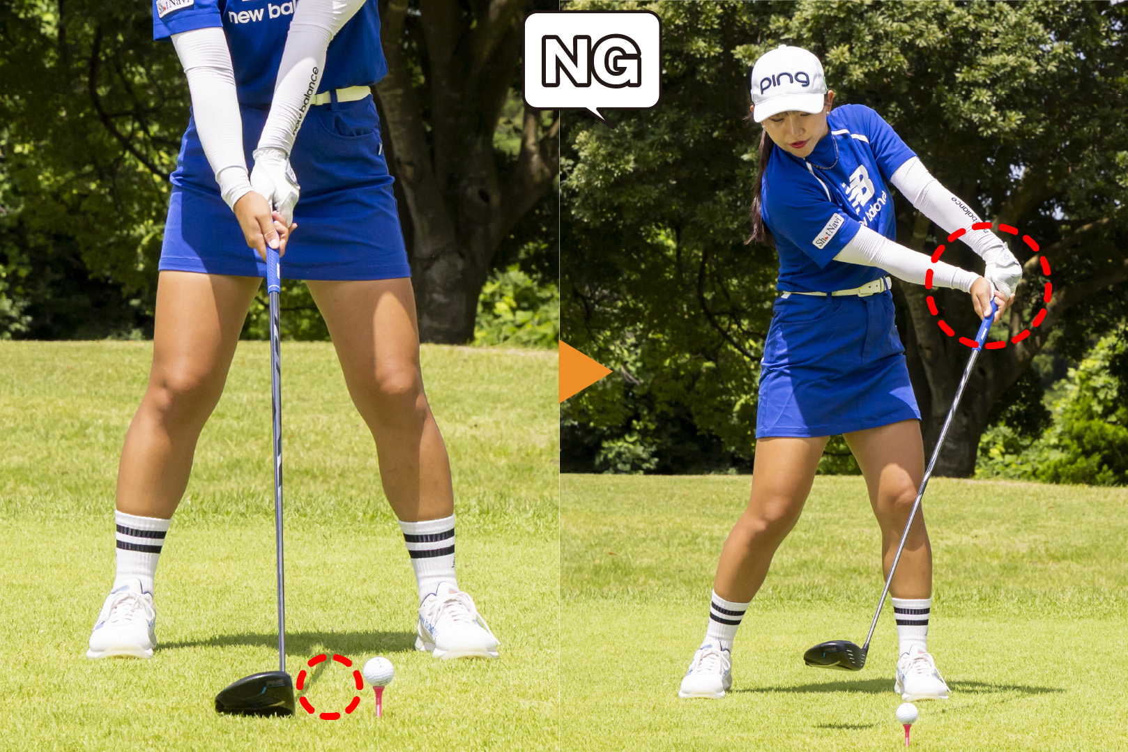 【NG】ボールからヘッドを離して構えると、インパクトで両手を前に出してしまいがちです