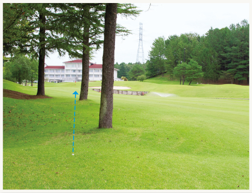 もっとも広い空間からフェアウェイに戻すのが基本。枝に当たらないように低く打ち出して。フェアウェイに届かなかったり、フェアウェイに届かなかったり、フェアウェイを通り越して向こう側のラフに行かないよう、距離感も大事。フェアウェイに戻すだけでもちゅい事項が多いのに、ピン狙いは無謀!
