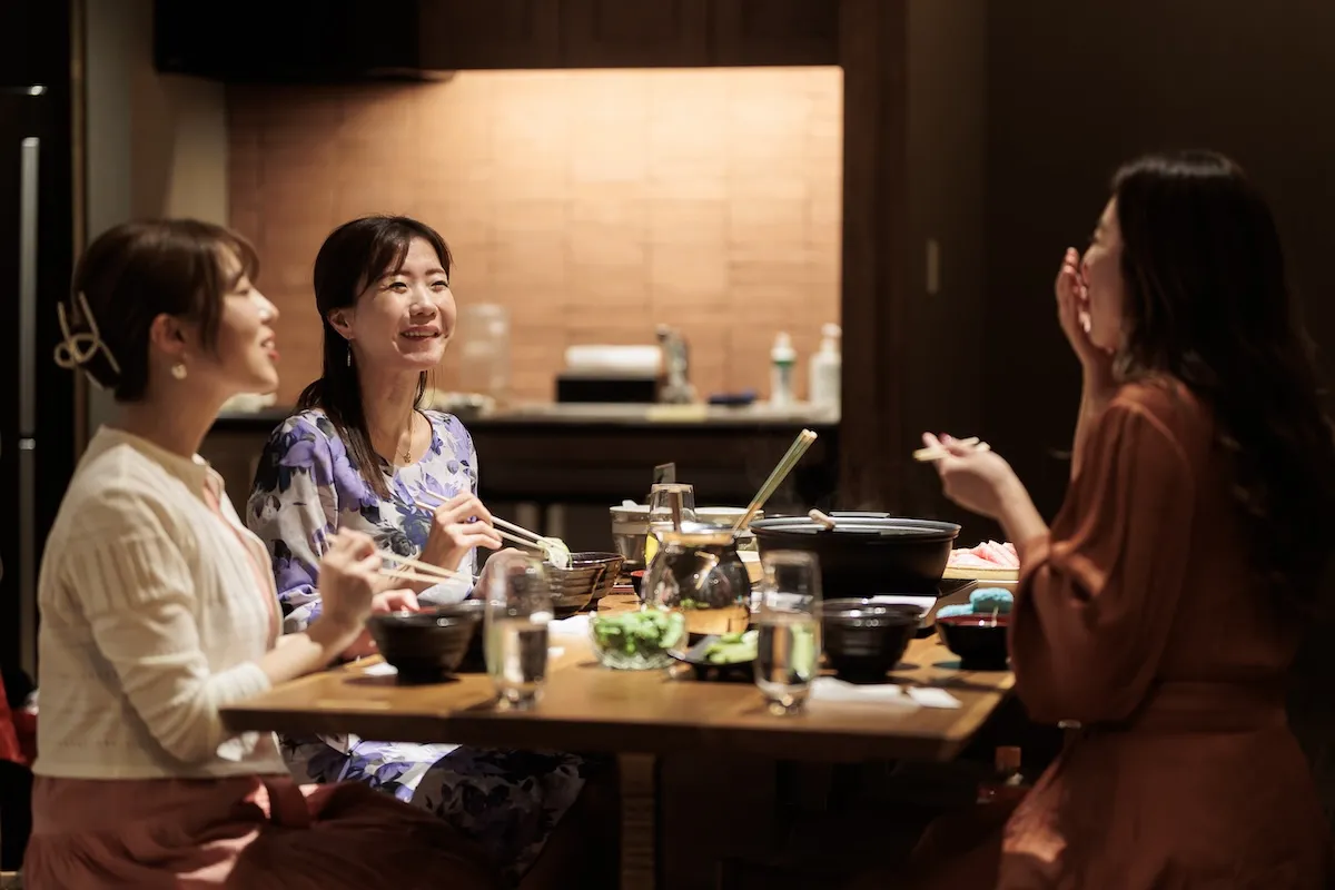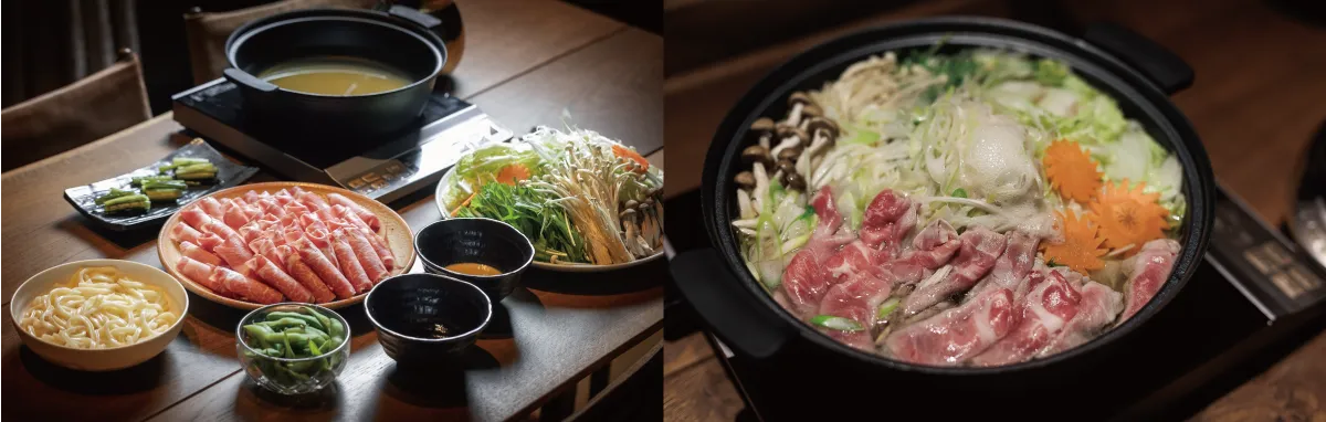 夕食は信州豚と地元・長野県産の新鮮野菜をたっぷりと使った豚しゃぶを、お部屋の中でいただきます。野菜と豚の甘みが出た優しい出汁は絶品。〆のうどんまで、箸が止まりません。