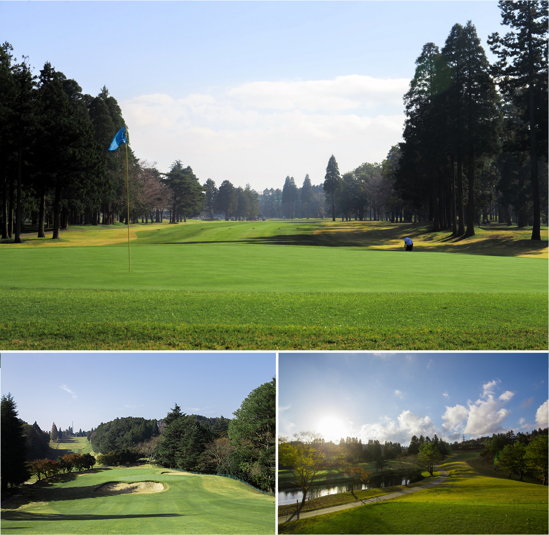 東・西・南の3コースは樹齢を重ねた林がホール間をセパレート。距離はそれほど長くないものの、ドッグレッグや池越え、谷越えなど変化に富んだ丘陵コースのデザインと、のびのび打てる林間コースのデザインをバランスよく配してプレーヤーを飽きさせません。