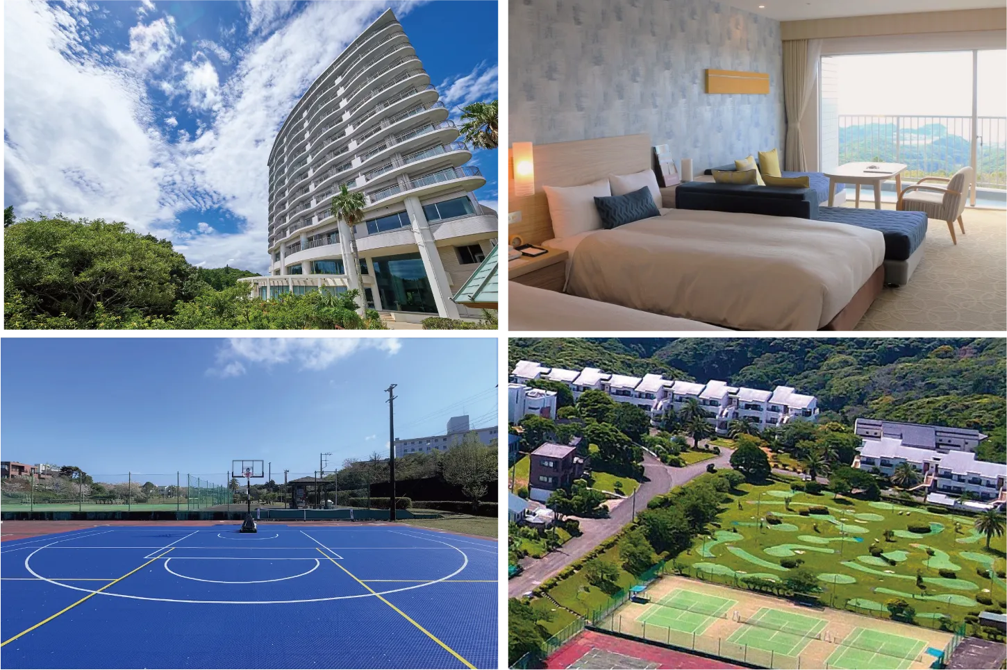 コースから車で約5分。全室オーシャンビューのホテルハーヴェスト勝浦。大浴場は温泉、サウナ付き。屋外プール(夏季のみ)もある。下段:勝浦東急サニーパークの多目的コート、パターゴルフ場とテニスコート