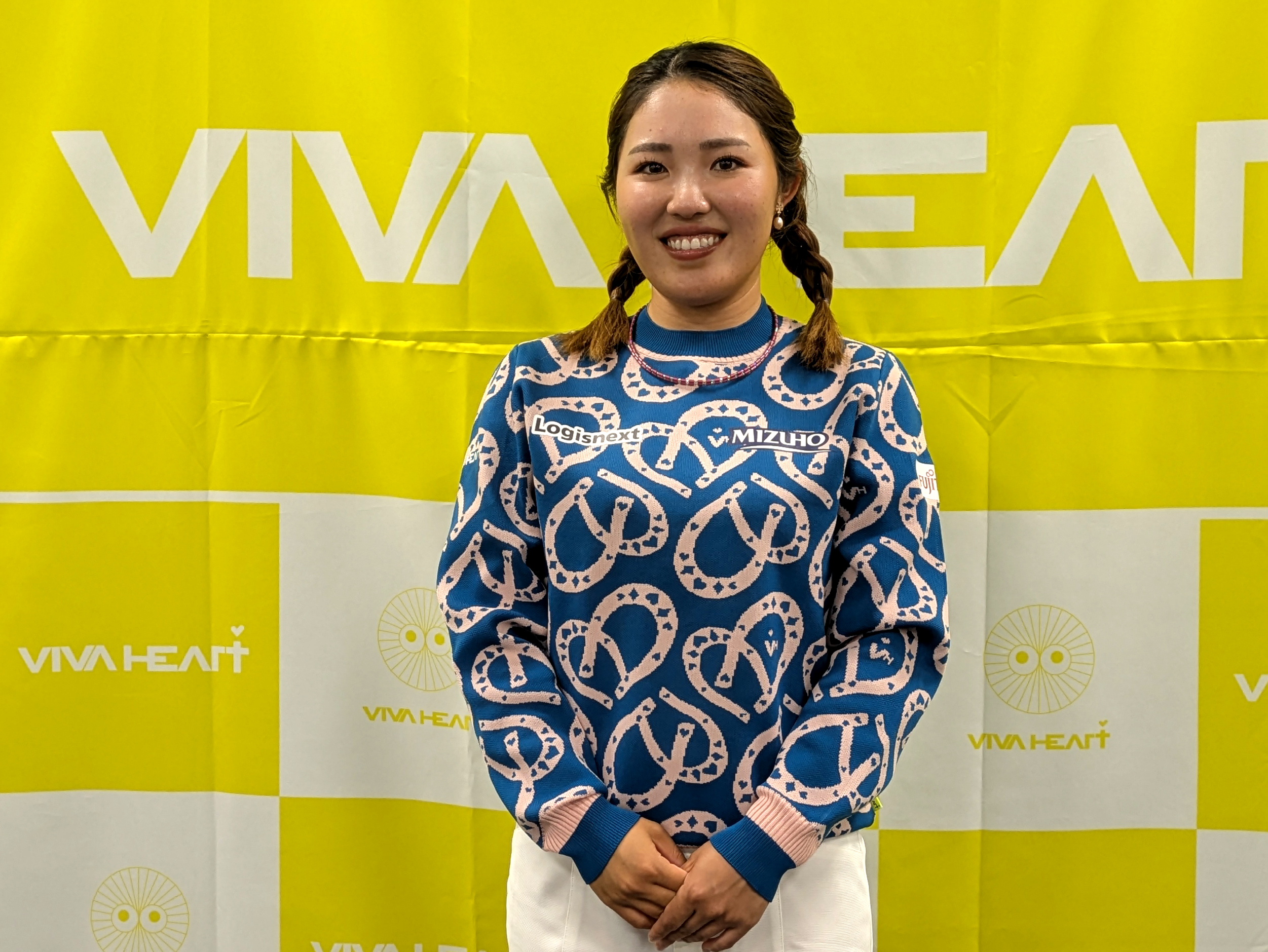 VIVA HEARTとの関係は長く、「小学生のころ(小5〜6)から着ています。当時、有村智恵さんが着ていて、ピンクやハートのデザインが可愛いなと思っていました。そこからずっと好きです」と原点を語りました。
