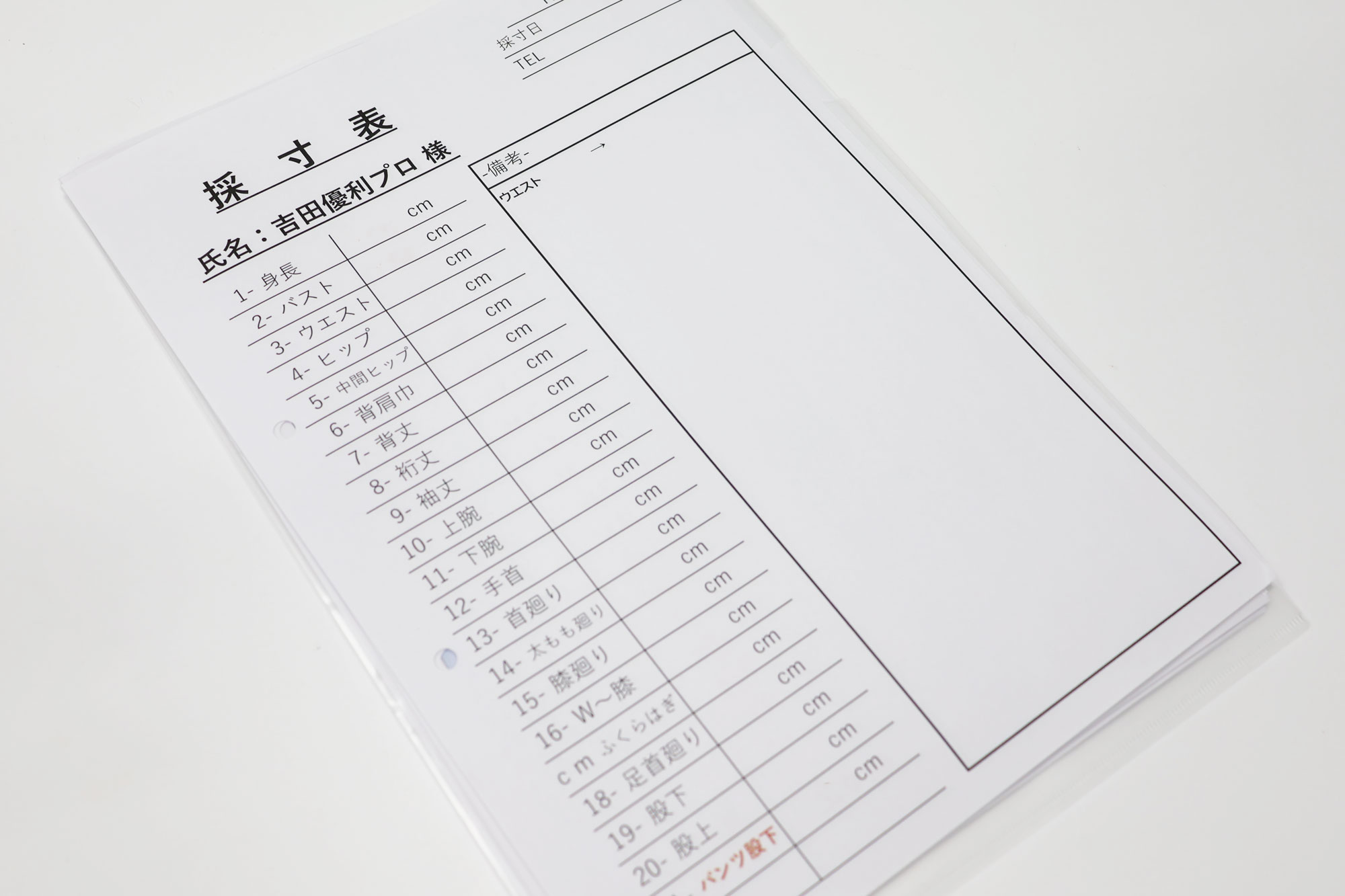 スタジオの一角で始まった採寸は、決められた項目に沿って手早く進んでいきます。肩幅、バスト、ウエスト、ヒップに加え、腕まわりや太もも、ふくらはぎ、股下まで。採寸表には20項目以上が並び、毎年この工程が欠かさず行われていることが分かります。